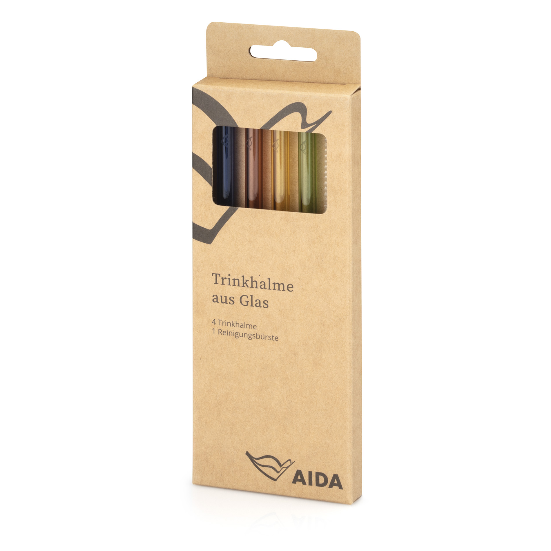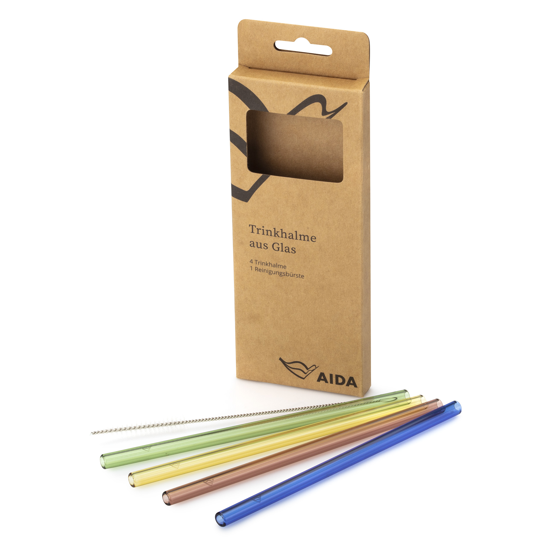 - 4 Glastrinkhalme 8 mm Breite & 180 mm Länge in den AIDA-Farben Blau, Rot, Gelb & Grün (Farbton angenähert) plus 1 Reinigungsbürste