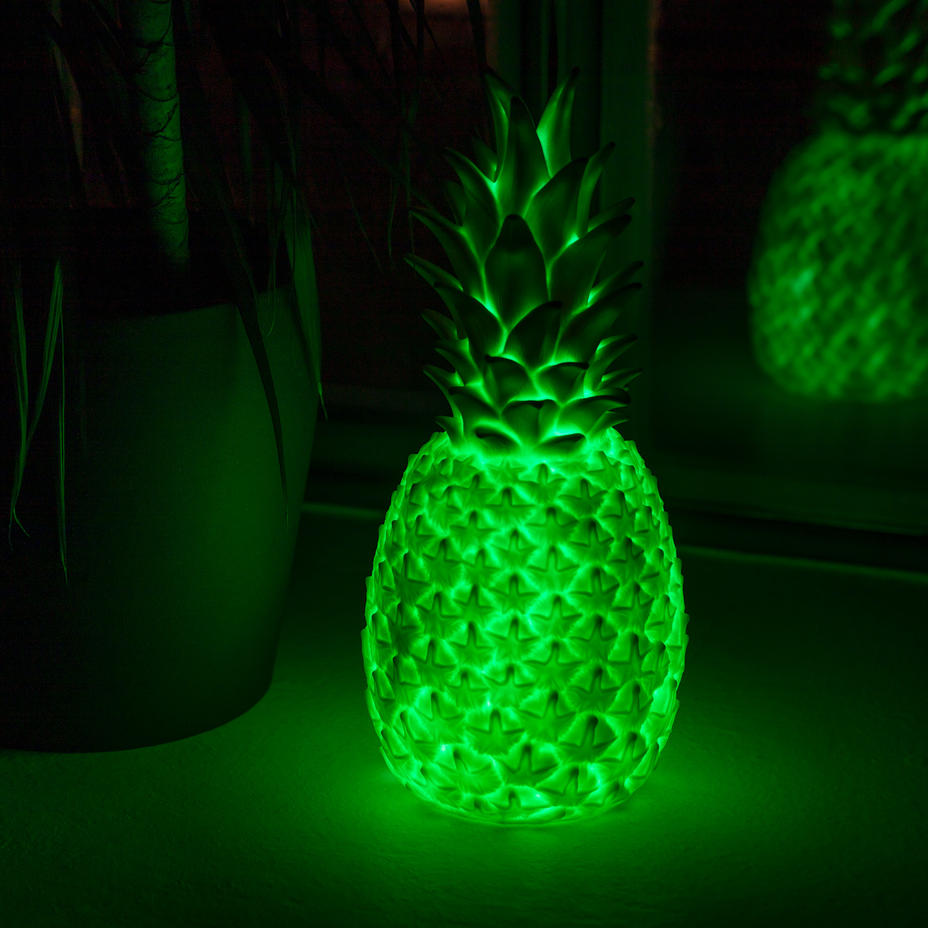 Die Piña Colada Leuchte™ in realistischem, einer echten Ananas sehr nahekommenden Design und feiner Oberflächenstruktur. Gefertigt aus bruchfestem Vinyl, was dem Lichtobjekt eine warme, weiche Haptik verleiht. Sie ist abwaschbar, Spritzwasser geschützt und in vier Farben erhältlich.
