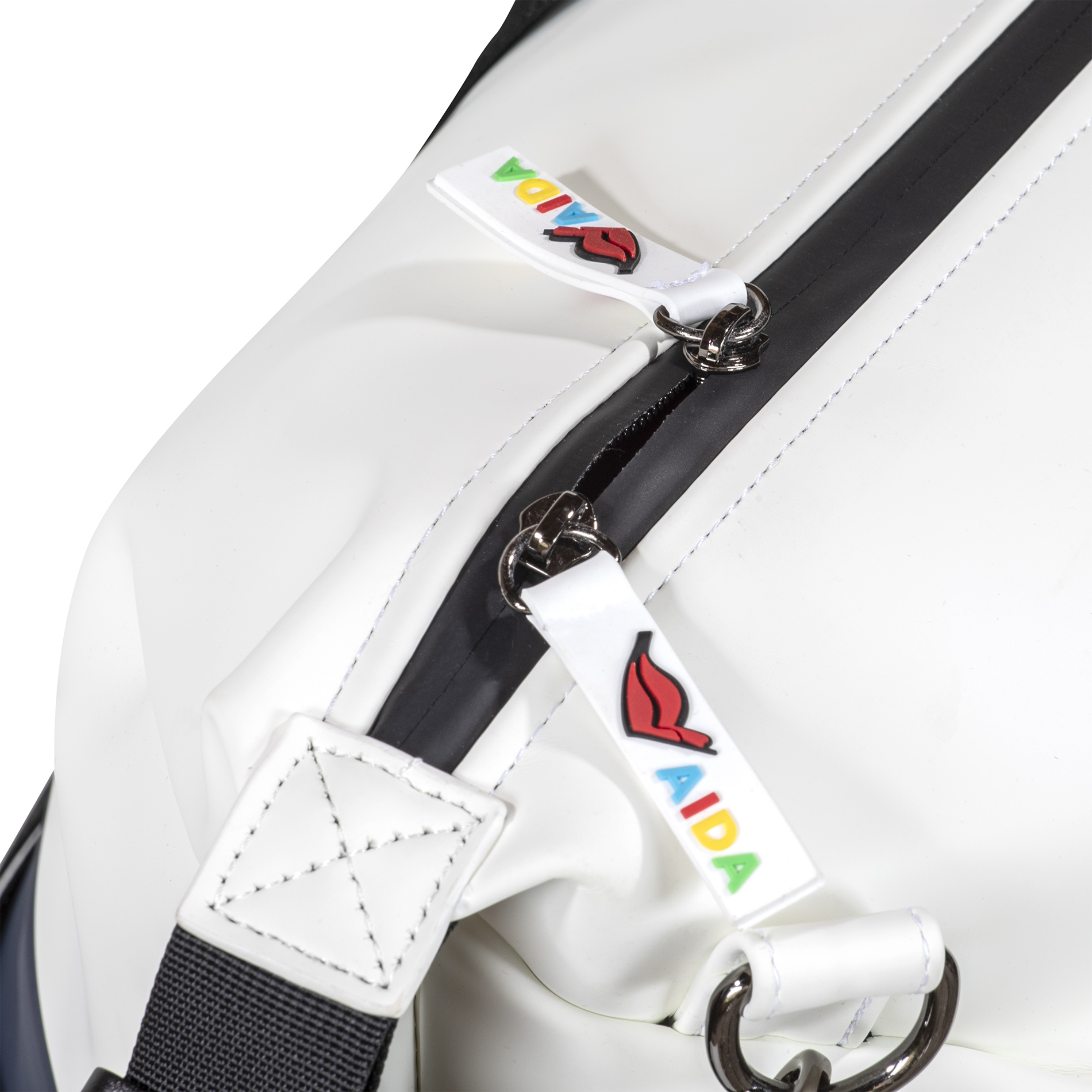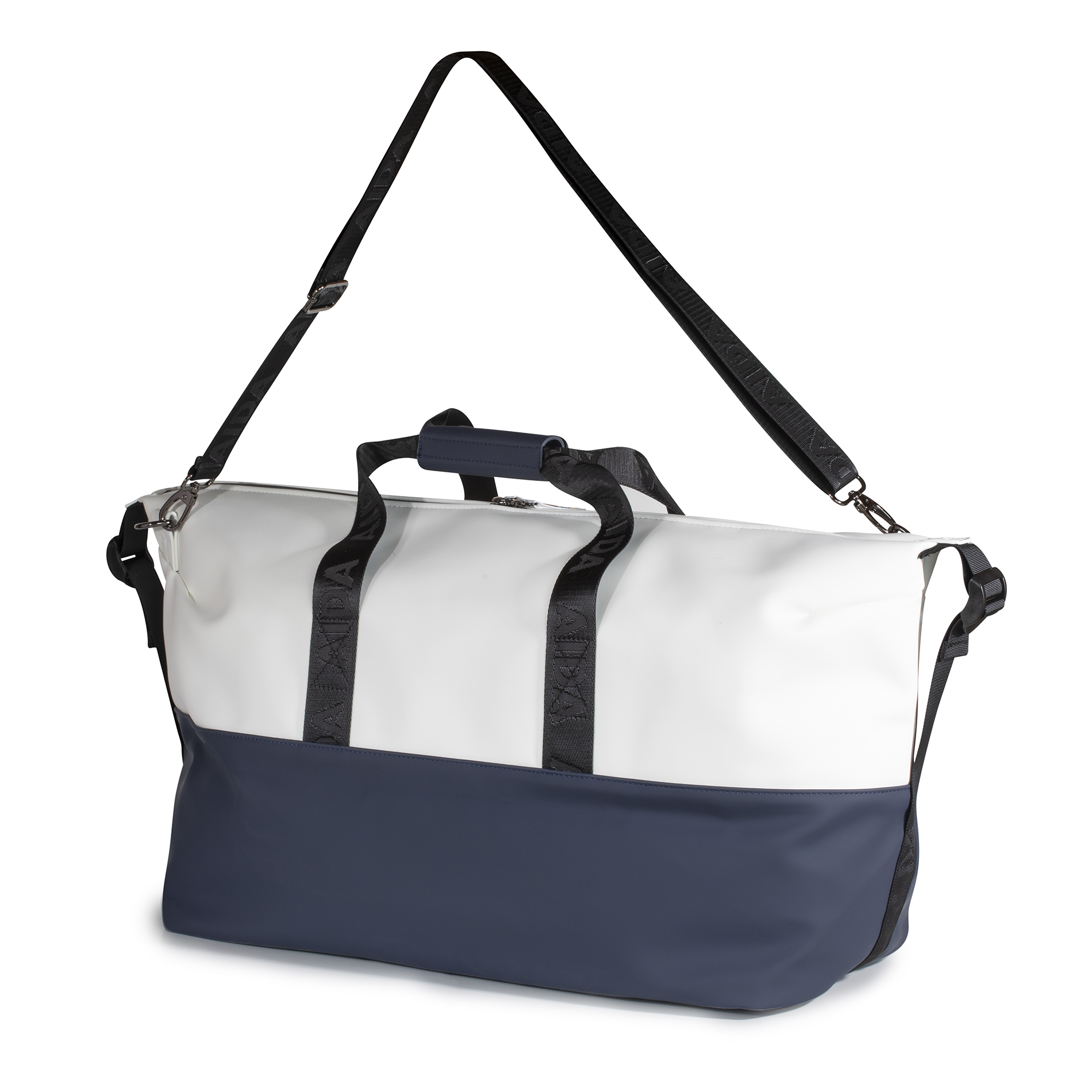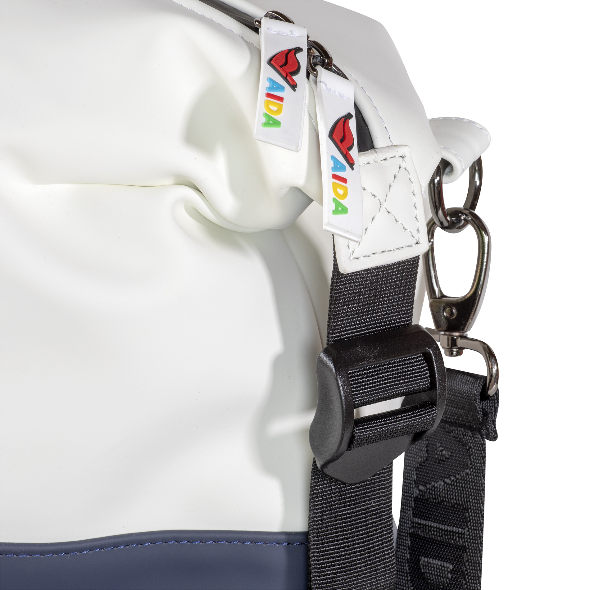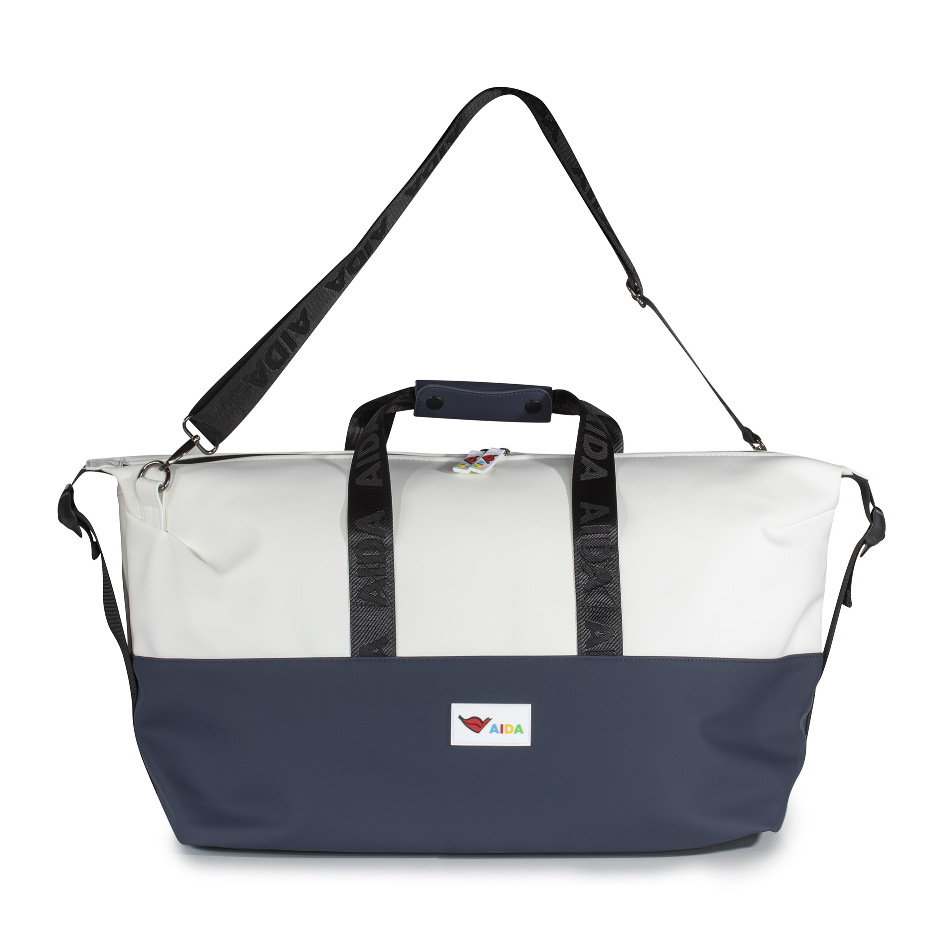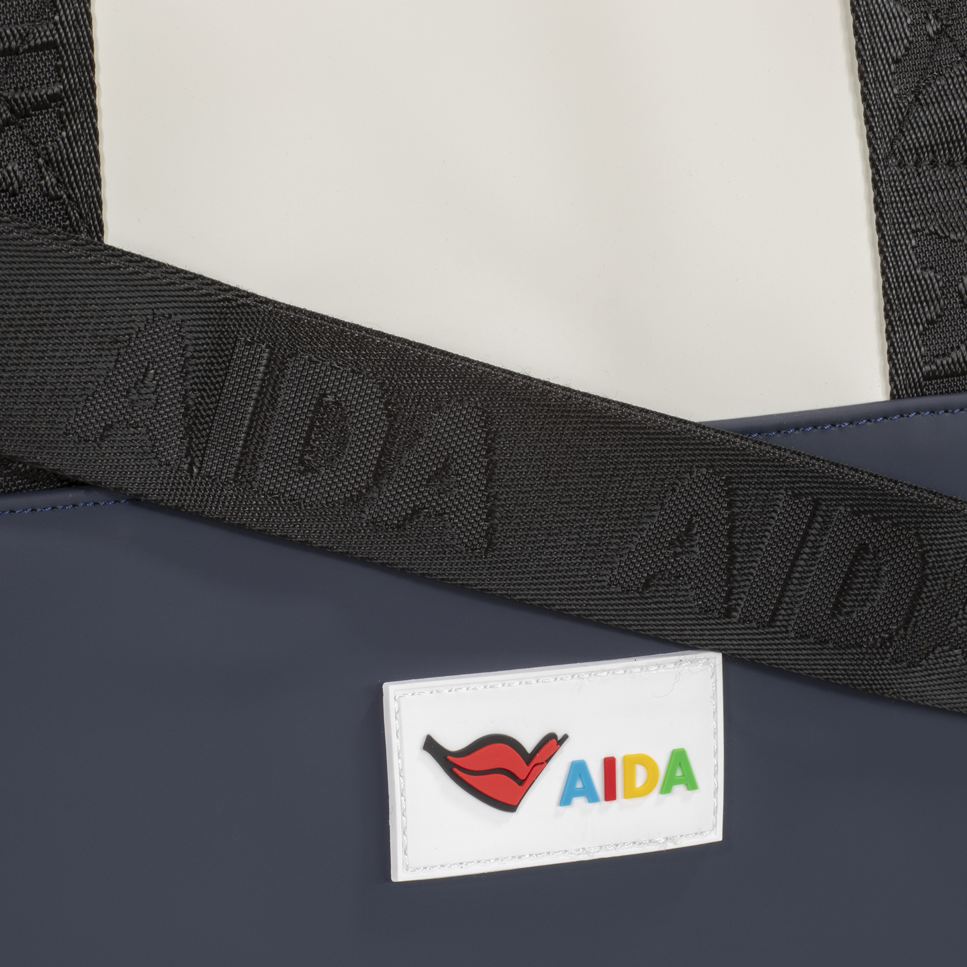 Design: Zwei-Farben-Optik in elegantem Weiß und Marineblau mit schwarzem AIDA-Schriftzug auf den Tragegriffen