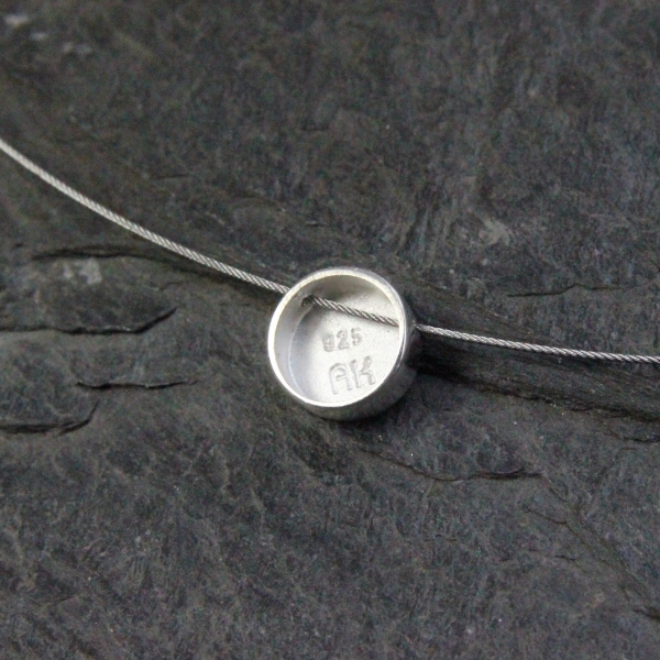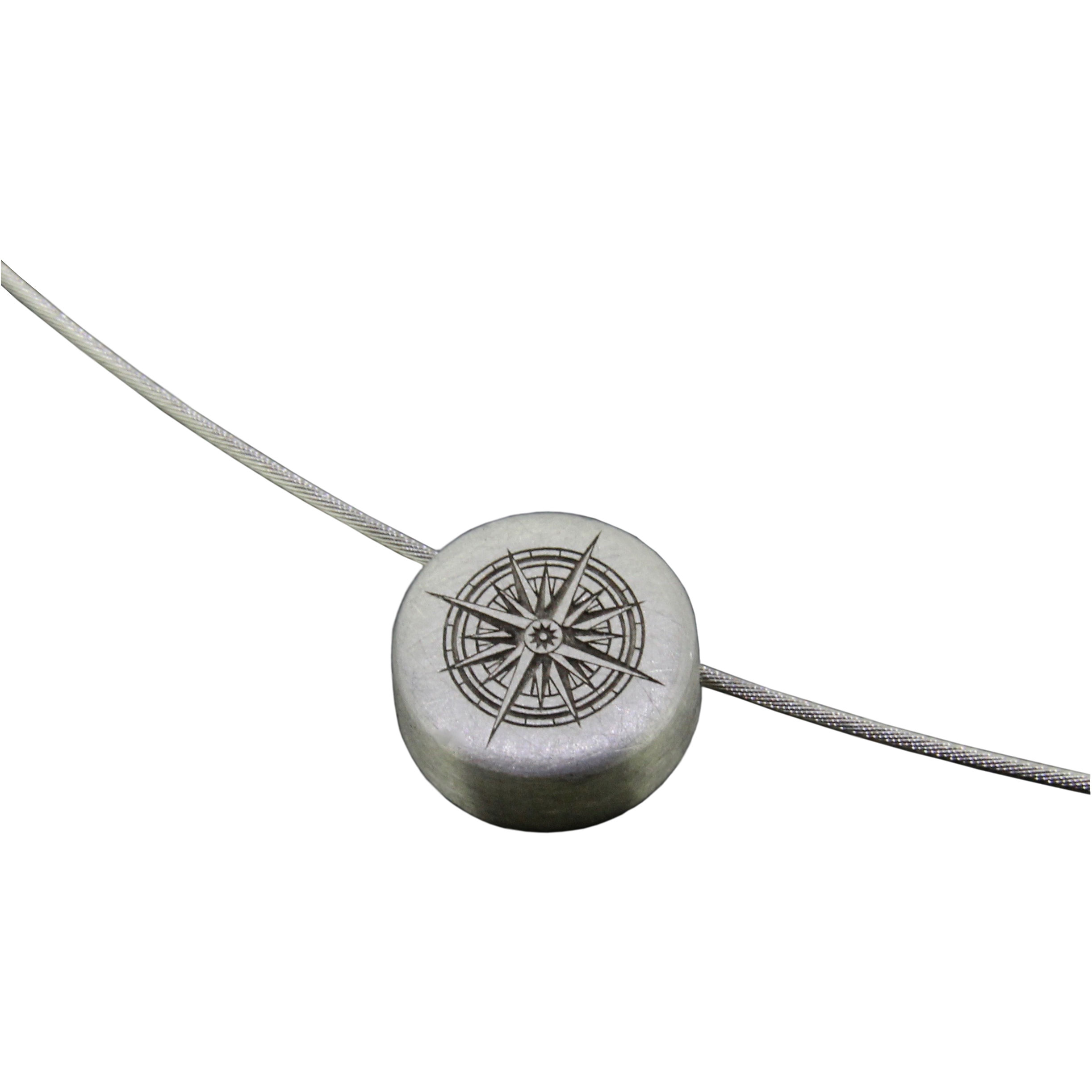 Dieser kleine silberne Anhänger, der mit einer feinen Lasergravur eine Kompassrose zeigt, hat einen Durchmesser von ca. 10mm und hat eine gebürstete Oberfläche. Die seitliche, breite Kante ist poliert und gibt dem Anhänger ein kompaktes Aussehen. Der Edelstahlreifen hat eine Länge von 42cm.