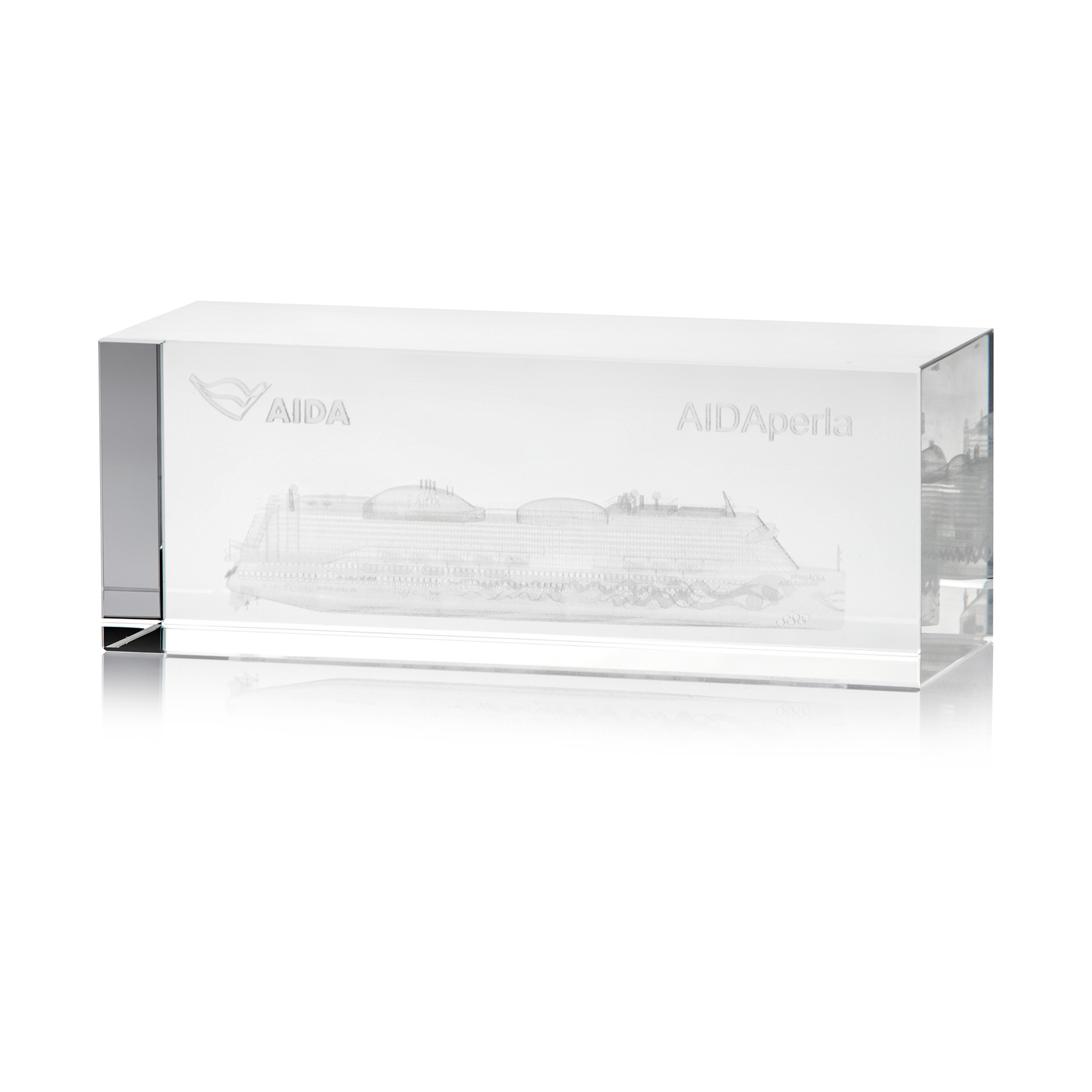 Der Glasblock AIDAperla ist die perfekte Ergänzung zu unseren AIDA Modellen aus Metall. Die edlen Schiffshologramme haben können auch als Brief- oder Papierbeschwerer genutzt werden, da sie sehr massiv sind. Die Schiffsumrisse werden von einem 3D Laser in den Glasblock graviert. Als Vorlage dienen die original Werftdaten.