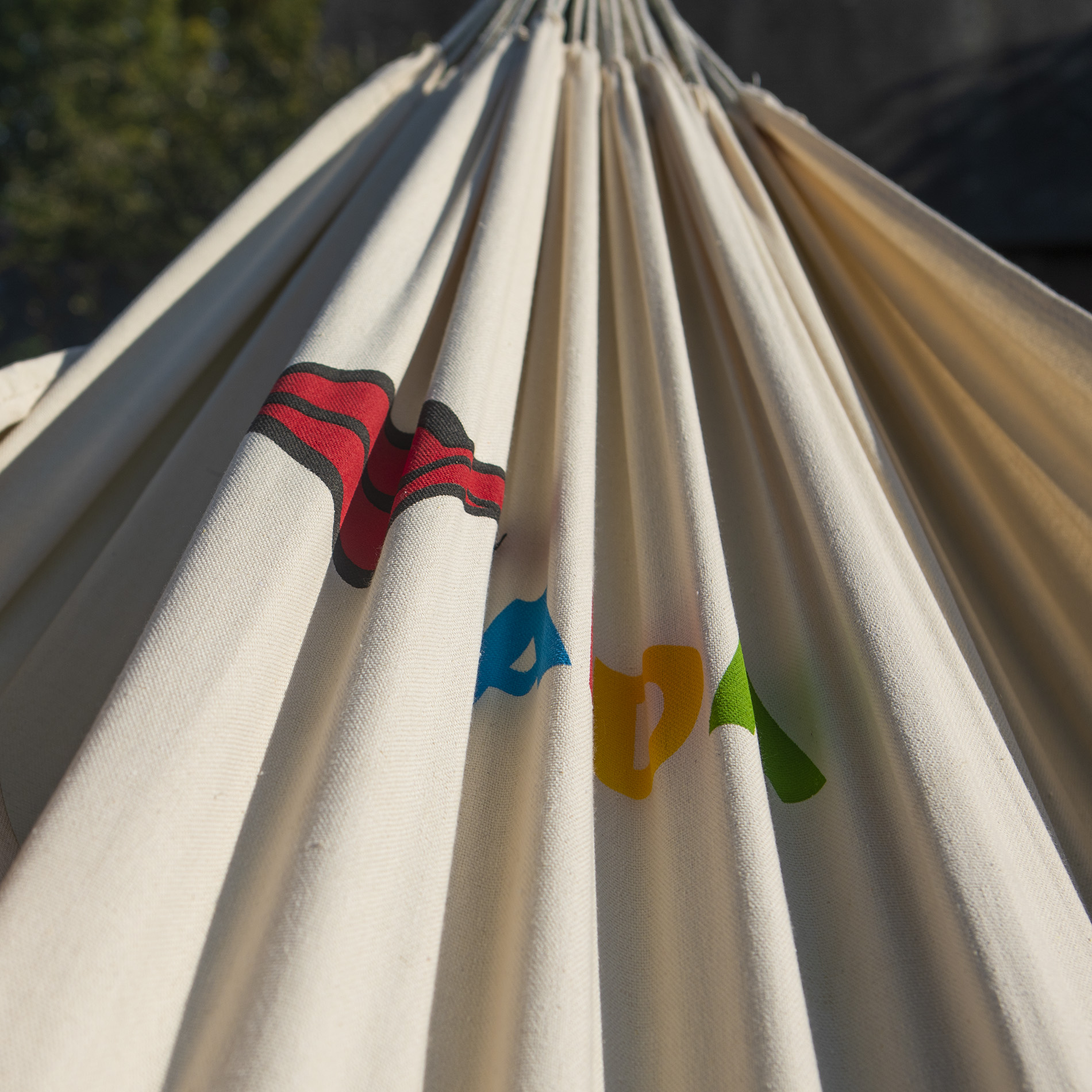Das AIDA Logo ist farbig aufgedruckt. Die Hängematte ist waschbar. Die Kanten sind besonders reißfest. Die Hängematte kommt ohne Holzleiste an den Enden. Dadurch ist sie deutlich sicherer gegen kippen und auch für Kinder nutzbar.