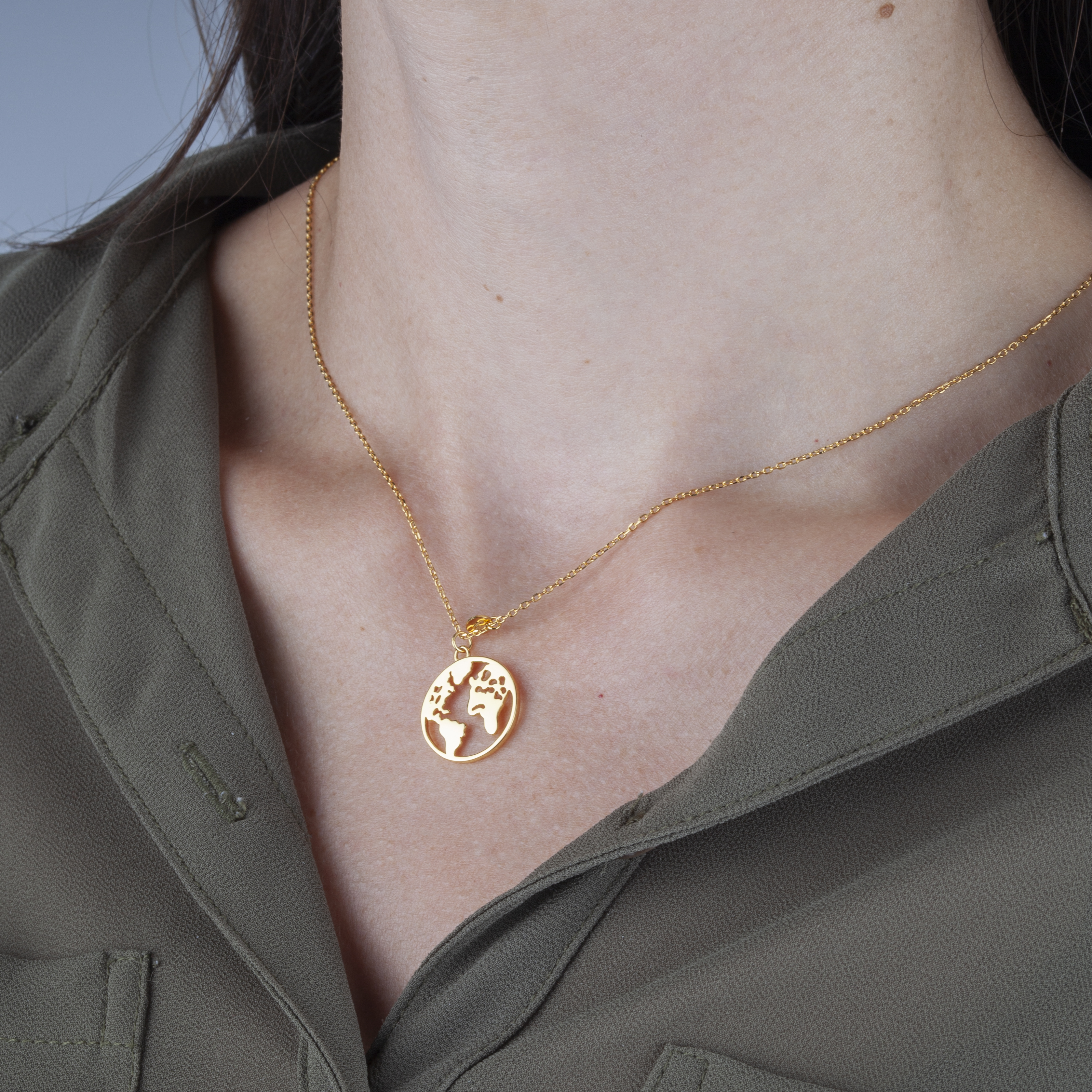 Erleben Sie die Welt in all ihrer Pracht mit dieser bezaubernden vergoldeten Kette, die einen Weltanhänger trägt. Diese Kreation ist eine Hommage an die Schönheit und Vielfalt unserer Erde und wird Ihren Look mit einem Hauch von Reiselust und Abenteuerlust bereichern. Der Anhänger, kunstvoll vergoldet und fein gestaltet, präsentiert die Kontinente und Ozeane unserer Welt in einer eleganten und detaillierten Darstellung. Egal, ob Sie ein leidenschaftlicher Reisender sind, die Schönheit der Welt schätzen oder einfach nur Ihre Liebe zum Reisen zum Ausdruck bringen möchten, diese vergoldete Kette mit Weltanhänger ist ein zeitloses und vielseitiges Accessoire.