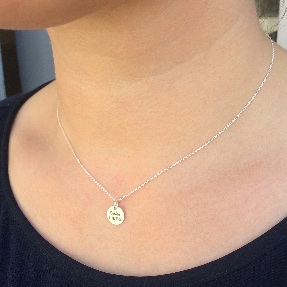 Dieser kleine Anhänger hat einen Durchmesser von 1cm. Die Gravur ist in den tiefen oxidiert, so entsteht ein schöner Kontrast zur fein matten Oberfläche.