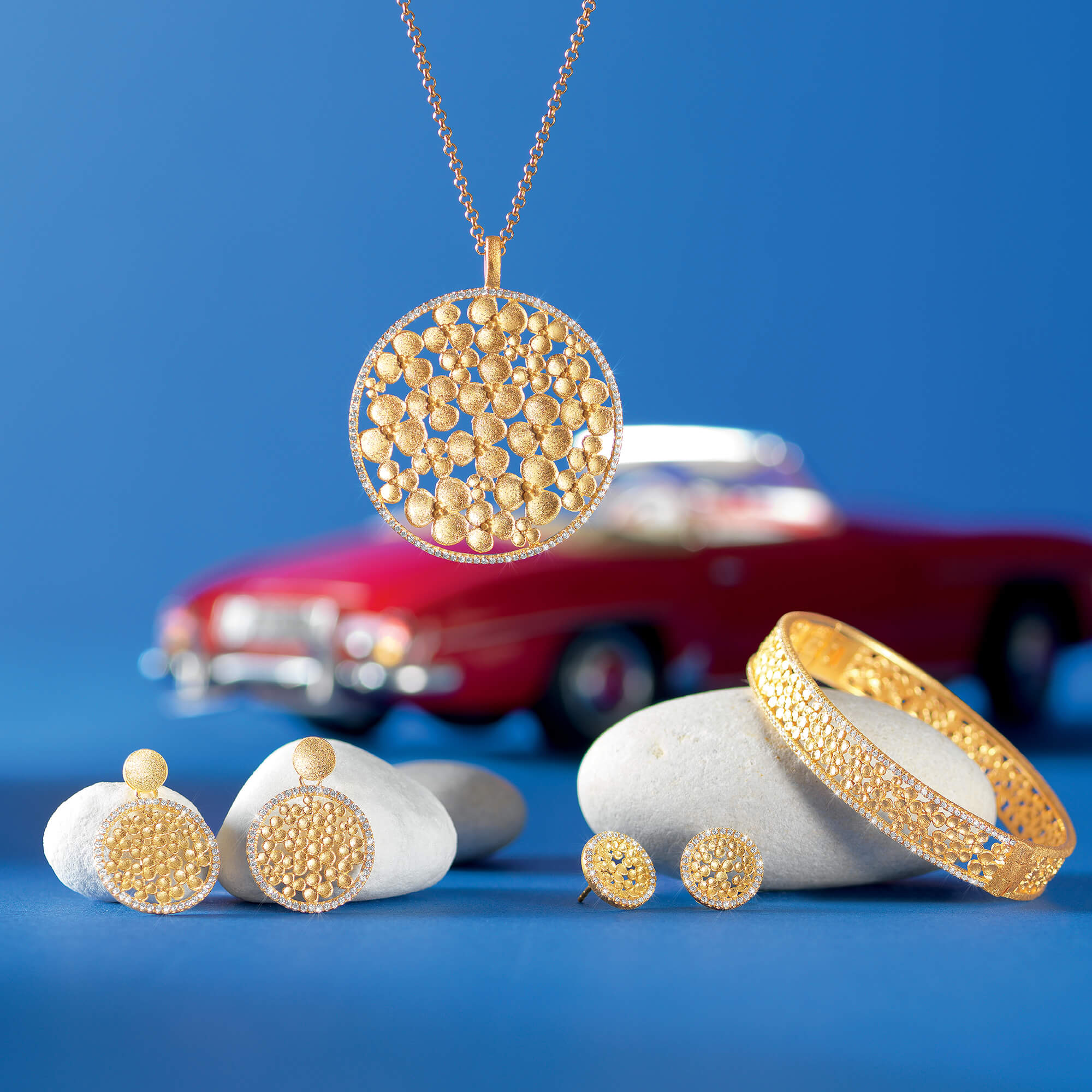 Die Schmuckstücke aus der BERND WOLF Manufaktur werden mit einer exzellenten 24-Karat Goldplattierung in Premiumqualität mit mehr als 50 Arbeitsschritten für jedes Element veredelt. Das Grundmaterial aller Schmuckstücke ist 925 Sterlingsilber. BERND WOLF verarbeitet ausschließlich Gold aus zertifizierten, ethisch einwandfreien Quellen. Die von BERND Wolf verarbeiteten Zirkoniasteine sind von höchster Qualität und mit dem Auge nicht von Diamanten in Top Qualität zu unterscheiden. Dank maximaler Farbbrillanz und perfektem Brillantschliff erinnert das klare Kristallweiß an eine Bergquelle, die im Sonnenlicht glitzert.