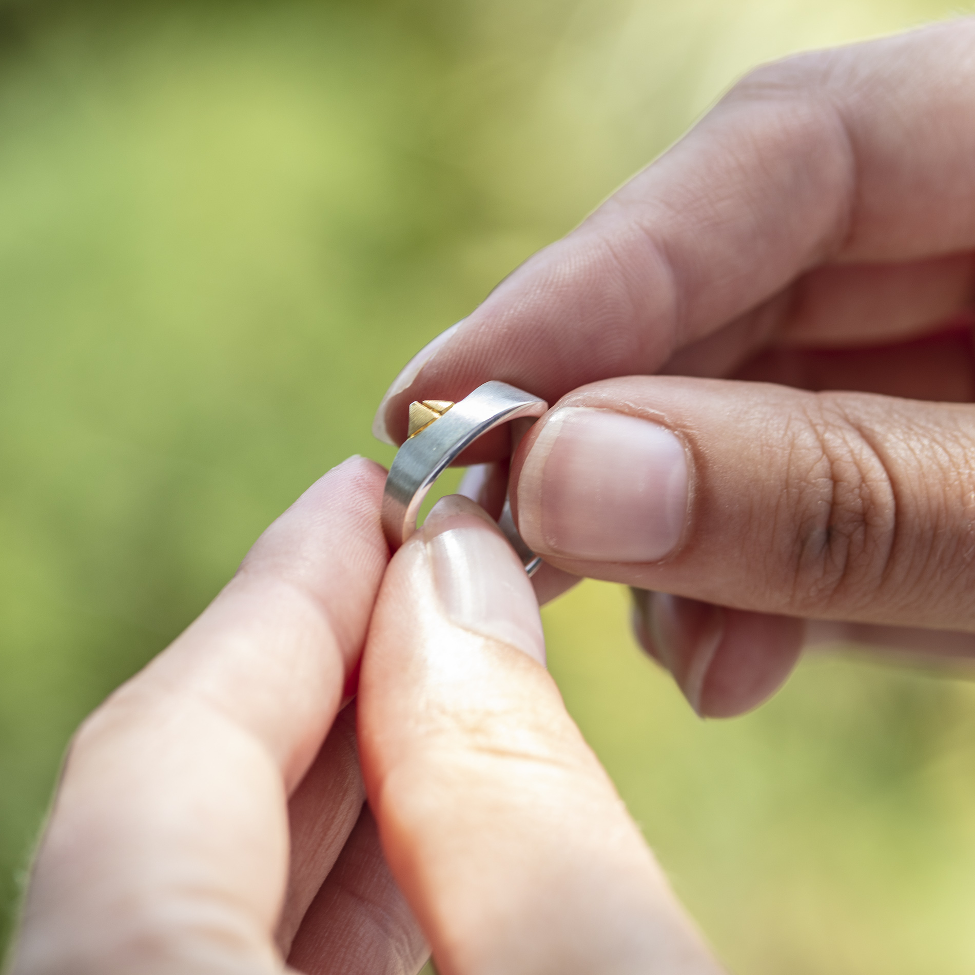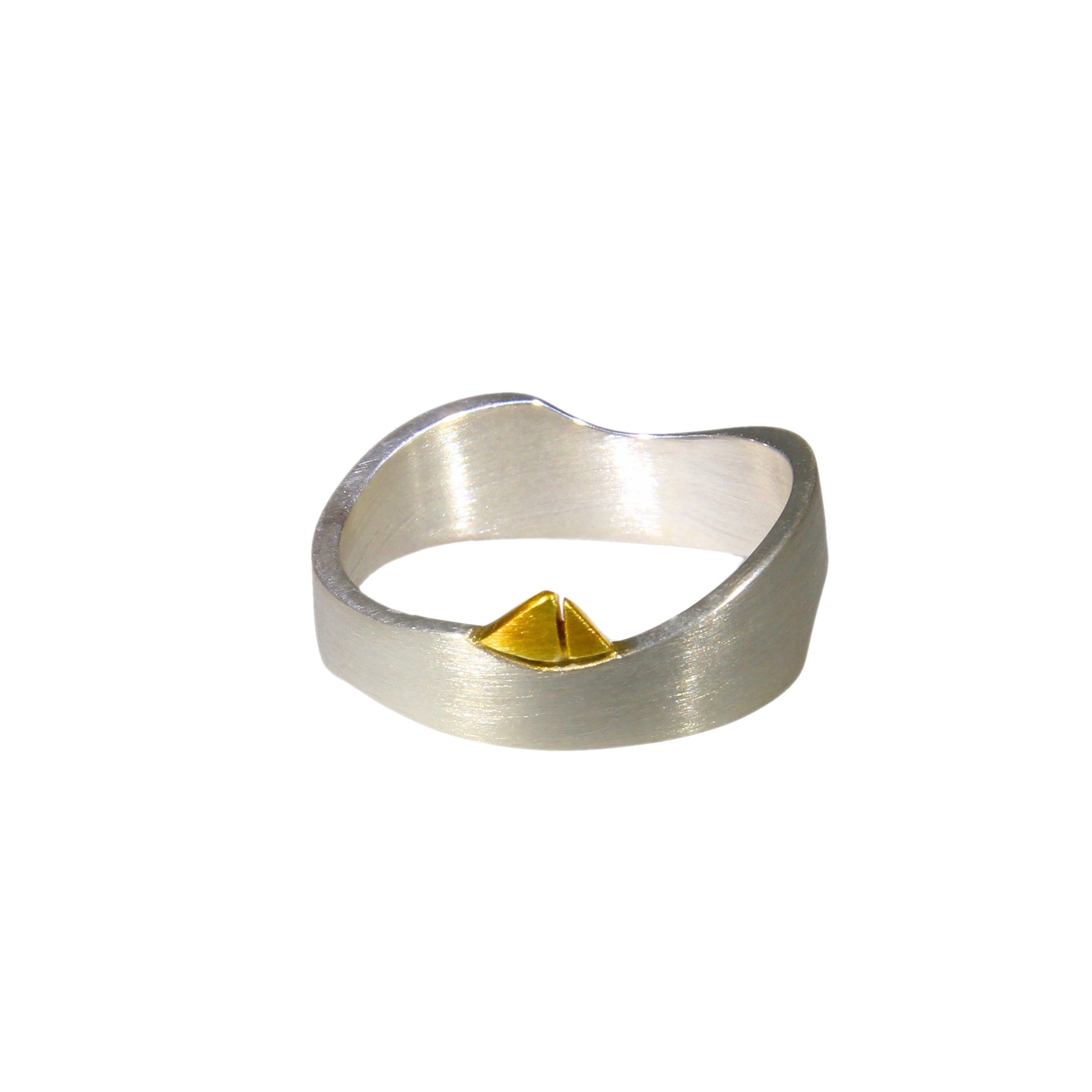 Eine schöne unregelmäßige Welle gibt diesem Schmuckstück seine Form, ähnlich wie die Brandung des Meeres. Als kleiner Eyecatcher ziert ein hartvergoldetes Segelboot den Ring. Die Breite der Ringschiene variiert von 4mm - 7,5mm. Die Oberfläche ist seidenmatt gehalten und nur die Seitenkanten sind poliert. Dieser Ring hat eine ganz besondere Optik und egal wie er sich am Finger dreht, es bleibt immer spannend.