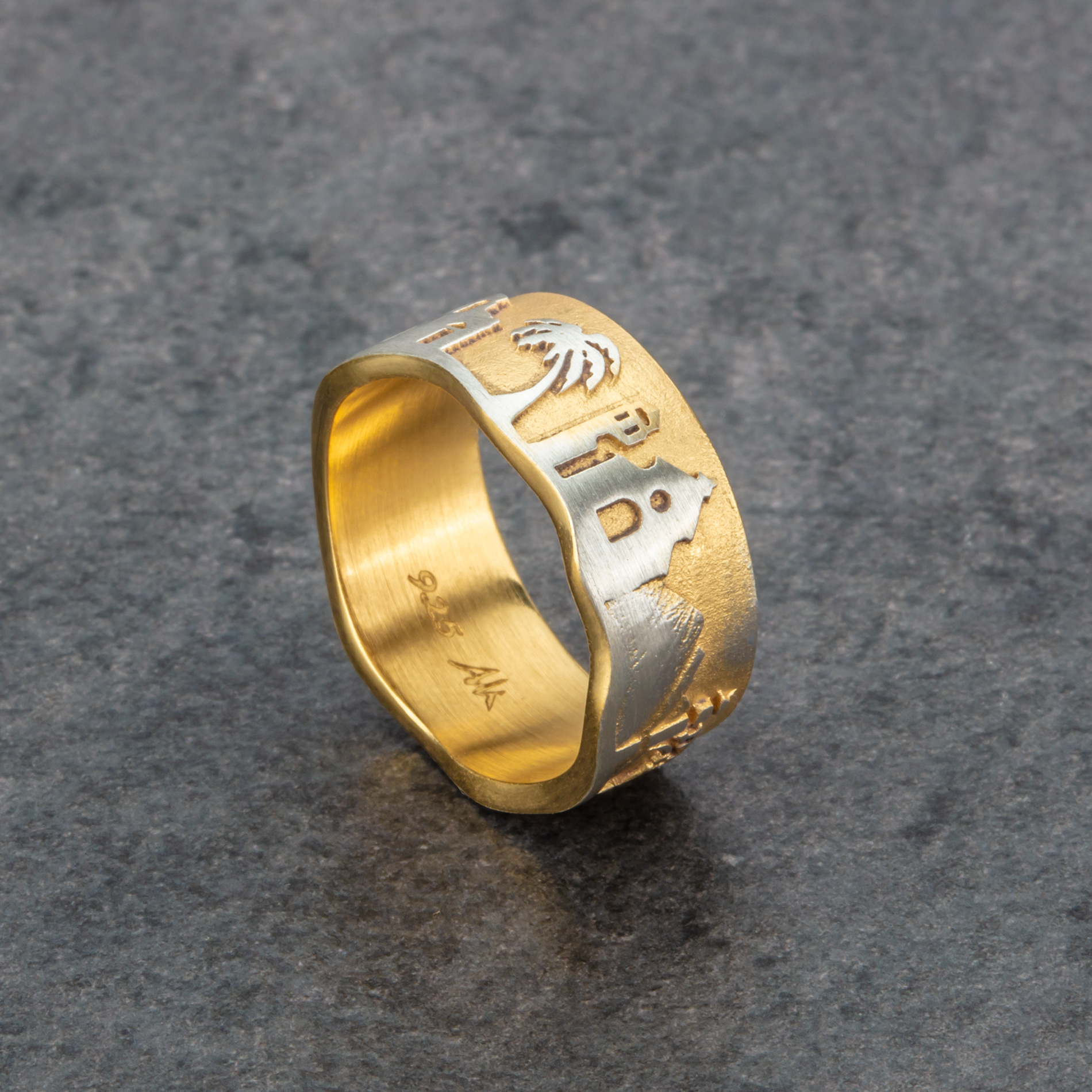 Der Ring „Karibische Inseln“ aus 925er Sterling-Silber nimmt Sie mit auf die Reise in die zauberhafte Landschaft der karibischen Inseln. Die Welle am unteren Rand des Ringes symbolisiert das Meer und unterstreicht den maritimen Charakter Ihrer Reise. Der Ring wird in einer Rostocker Goldschmiedewerkstatt handgefertigt und hat je nach Ringweite eine Ringbreite von ca. 9 bis 10mm. Er besitzt ausgezeichnete Trageeigenschaften, ist formschön und solide gearbeitet.