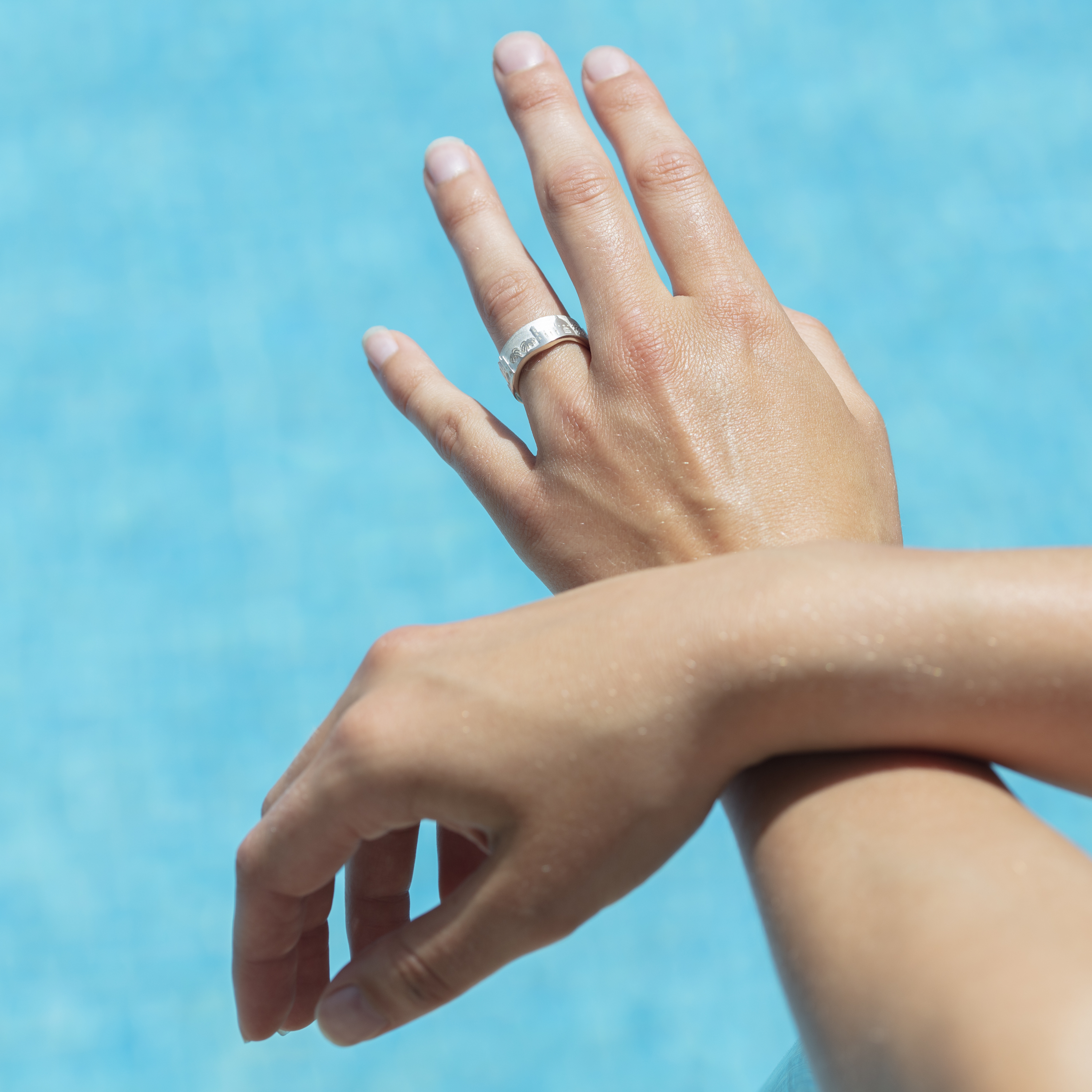 Der Ring Westliches Mittelmeer aus 925er Sterling-Silber nimmt Sie gedankliche mit auf die Reise in das wundervolle westliche Mittelmeer. Die Welle am unteren Rand des Ringes symbolisiert das Meer und unterstreicht den maritimen Charakter Ihrer Reise. Der Ring wird in einer Rostocker Goldschmiedewerkstatt handgefertigt und hat je nach Ringweite eine Ringbreite von ca. 9 bis 10mm. Er besitzt ausgezeichnete Trageeigenschaften, ist formschön und solide gearbeitet.