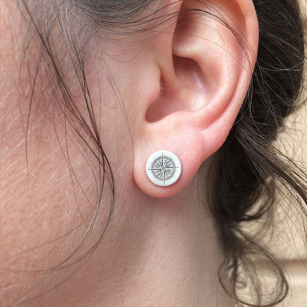 Passend zu unserem feinen Anhänger gibt es nun endlich auch die Ohrstecker. So komplettiert sich dieses schöne Set. Die Kompassrose steht symbolisch für das Meer und wettergegerbte Gesichter. Die feine Lasergravur auf den silbernen Ohrsteckern ist sehr detailliert und doch nicht verspielt. Ein schönes Paar für jeden Tag mit einem Durchmesser von ca. 10mm. Sie sind fein matt in der Oberfläche und die Gravur ist in den Tiefen dunkel oxidiert.