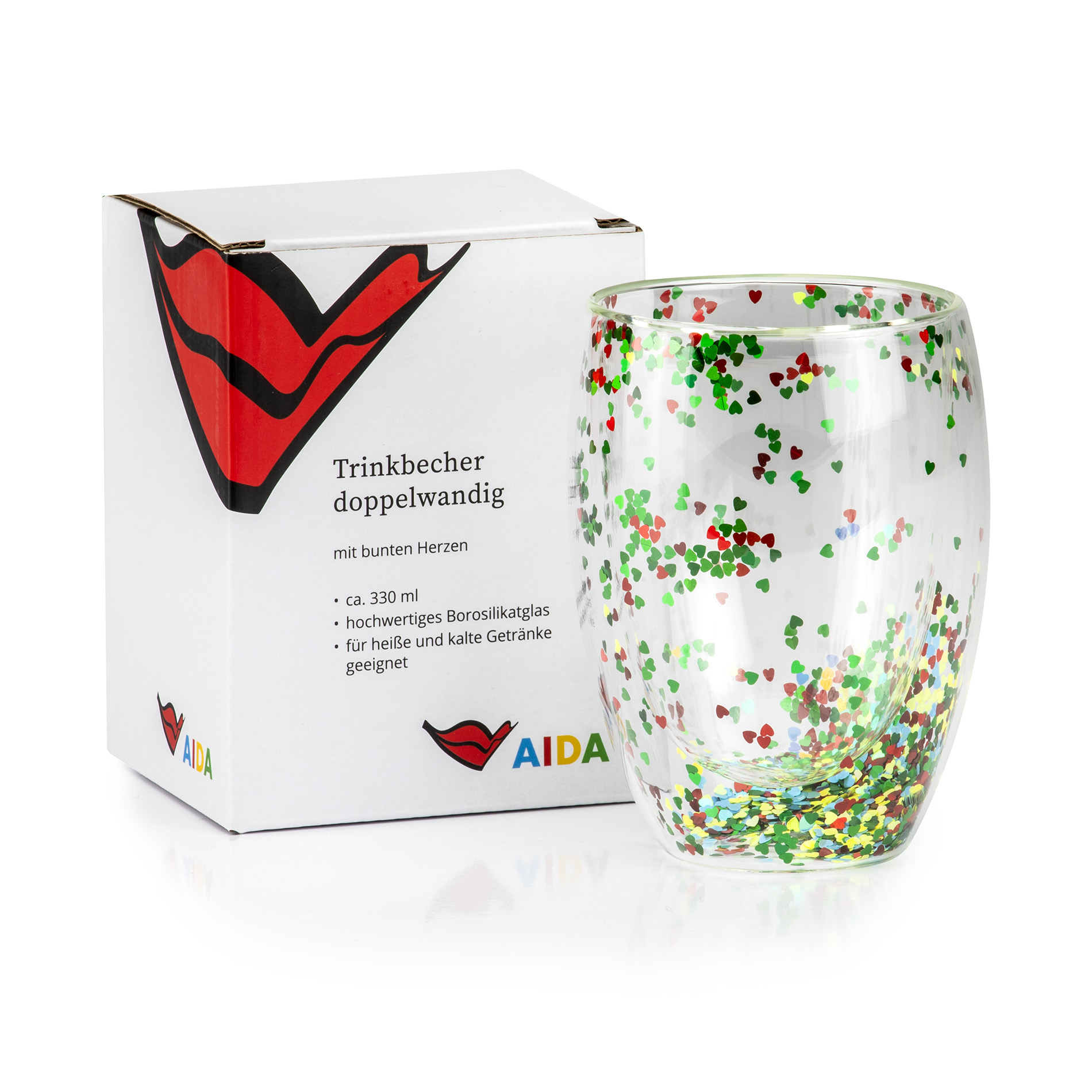 Produktinformationen "Trinkbecher mit Glitzer Herzen in AIDA Farben"