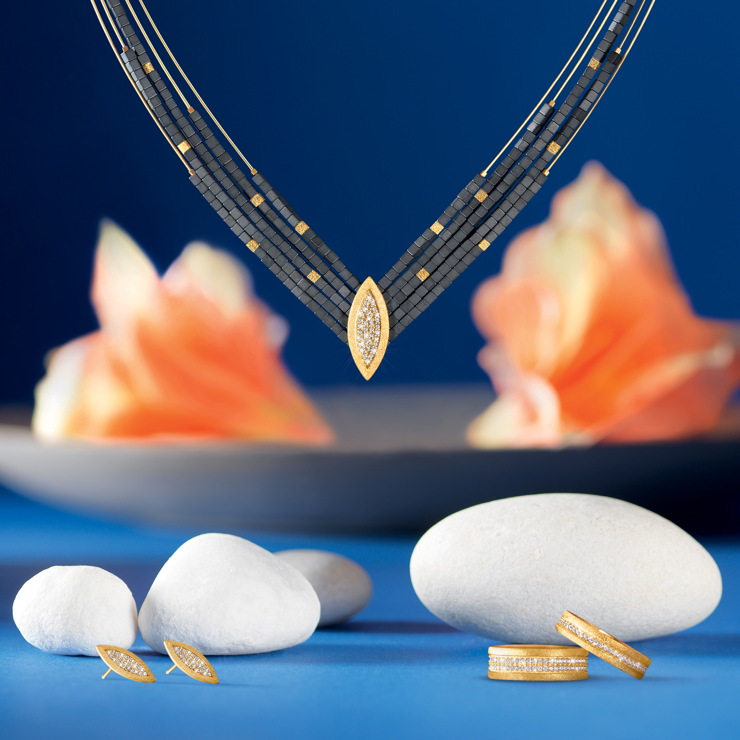 Das Valesa Collier verbindet in seiner außergewöhnlichen V-Form mit navetteförmigem Pavé-Steg die eleganten Reflexe des Hämatin mit dem aufregenden Funkeln des Zirkonia. Mit jeder Bewegung erzeugen die kleinen Hämatinwürfel des einzigartigen V-Colliers Valesa vielfältige, zauberhafte Reflexe. BERND WOLF verbindet mit diesem Schmuckstück eleganten, matten Hämatin mit dem glitzernden Schimmer von funkelndem Zirkonia in einer Mikropavé-Fassung. Machen Sie das Set perfekt mit den passenden gleichnamigen Ohrsteckern und den Ringen Pascalini oder Pascala.