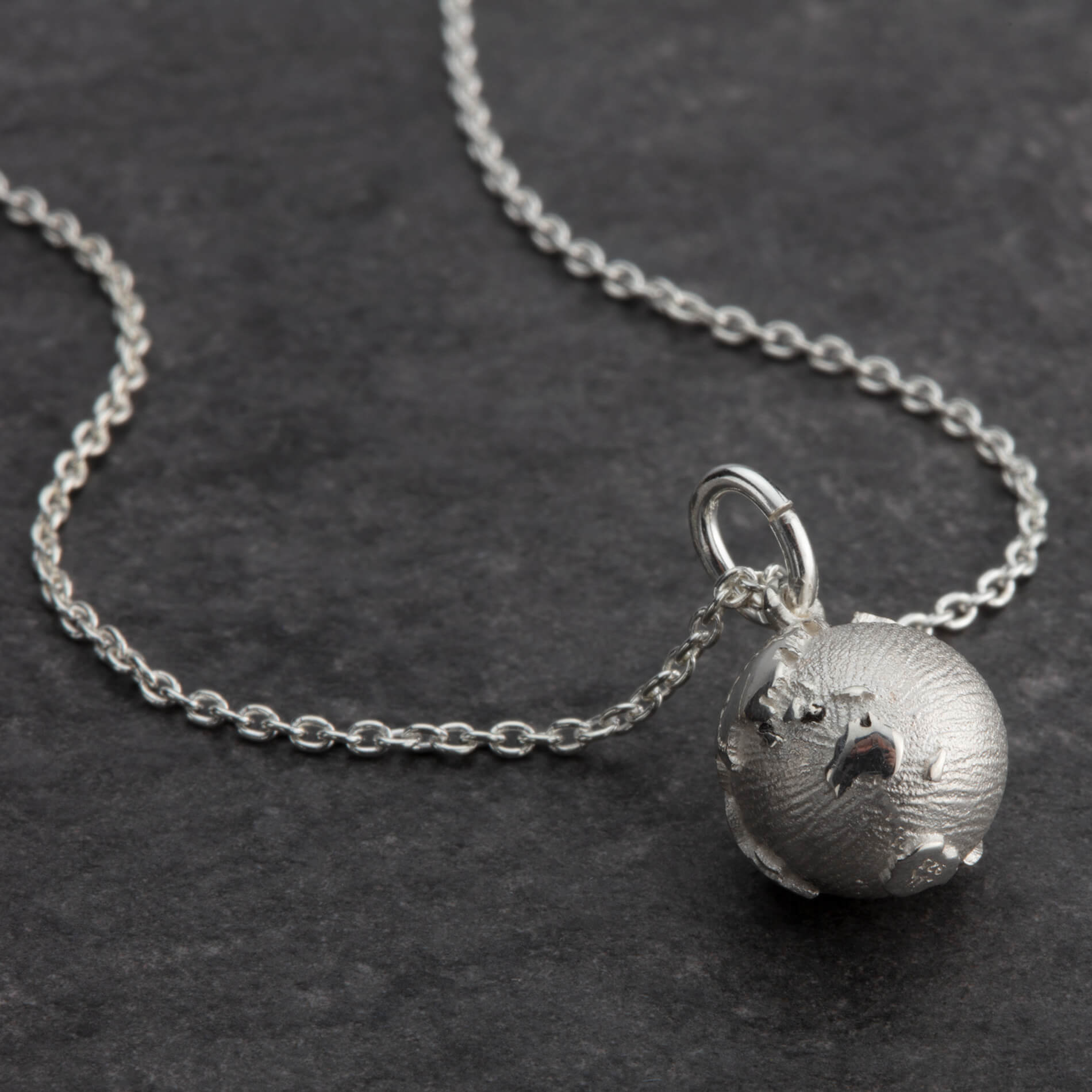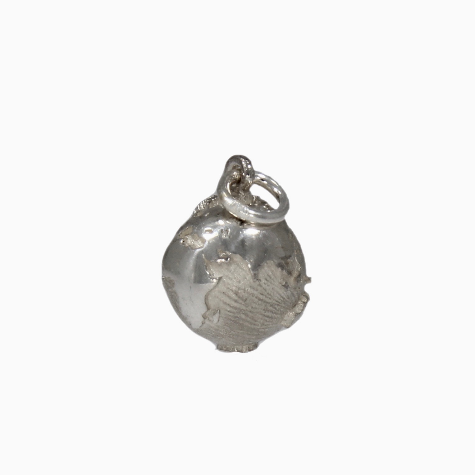 Nur 1cm im Durchmesser zeigt die silberne Weltkugel nicht nur Kontinente, sondern auch die wichtigsten Inseln. Feine Wellen sind auf den Meeren und Ozeanen zu sehen und die Oberfläche des Festlandes ist glänzend poliert. Ein wunderschönes und völlig zeitloses Schmuckstück.